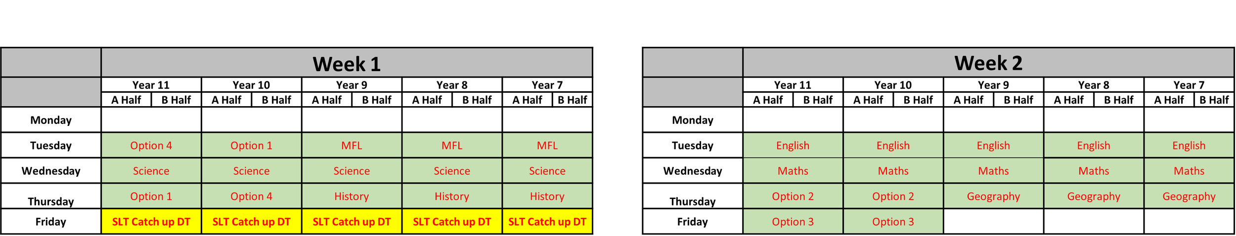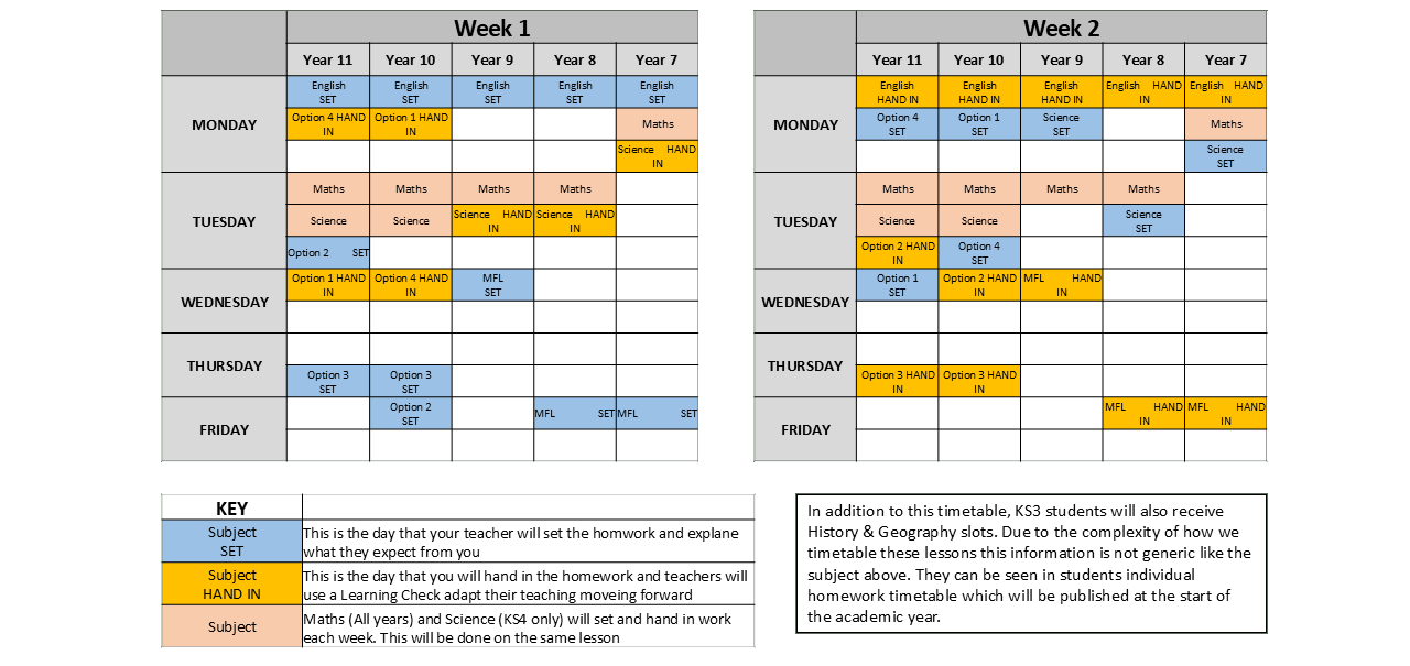 •At Key Stage 4: Maths & Science subject will set homework every week. English & Option subject will be set every 2 weeks.